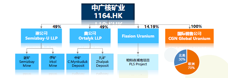 中廣核礦業的主要業務是核能企業使用的天然鈾資源的開發與貿易。公司目前持有資產包括: 1.哈薩克斯坦謝米茲拜伊鈾公司49%的權益和產品包銷權。 2.哈薩克斯坦奧爾塔雷克公司49%的權益和產品包銷權。 3.加拿大鈾礦勘探公司FissionUraniumCorp.14.19%的股權,和20%的天然鈾產品包銷權以及額外15%的包銷選擇權。 3.中廣核國際鈾產品銷售有限公司100%的股權。