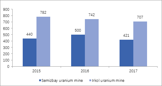 In early 2017, Kazatomprom announced that its controlled mine would reduce production by 10% to cope with the sluggish natural uranium market. The two mines of Semizbay-Uwere run well in 2017. The actual production is 1128 tons of uranium, 9.18% lower than 1242 tons in 2016, but the annual uranium mining plan was over-fulfilled. The actual uranium production of Semizbay-U mine is 421 tons and that of Irkol mine is 707 tons.