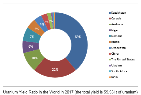 There are three kinds of ways to explore the main uranium ore: In-situ leach mining, open-pit mining and underground mining. There is about 48% of natural uranium produced by virtue of in-situ leach mining in the world, 46% from the conventional mining method (open-pit mining and underground mining), and 6% extracted as other minerals and by-products.